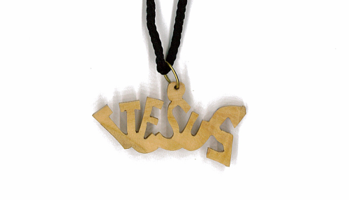 Schriftzug ‘Jesus’ aus Olivenholz, handgefertigt, nicht lackiert, mit schwarzer Baumwollkordel.