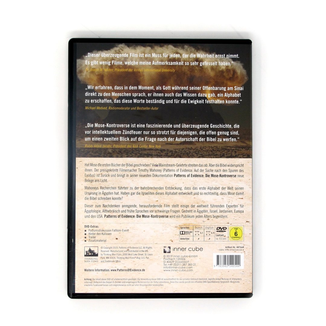 Patterns of Evidence – Die Mose Kontroverse. Hat Mose die ersten Bücher der Bibel geschrieben? Viele Mainstream-Gelehrte streiten das ab. Aber die Bibel widerspricht ihnen. Der preisgekrönte Filmemacher Timothy Mahoney (Patterns of Evidence: Auf der Suche nach den Spuren des Exodus) ist zurück und bringt in seiner neuesten Dokumentation Patterns of Evidence: Die Mose-Kontroverse neue Belege ans Licht. Mahoneys Recherchen führten zu der bahnbrechenden Entdeckung, dass das erste Alphabet der Welt seinen Ursprung in Ägypten hat. Haben gar die Israeliten dieses Alphabet entwickelt und so rechtzeitig, dass Mose damit die Bibel schreiben konnte? Dieser zum Nachdenken anregende, herausfordernde Film stellt einige der weltweit führenden Experten für Ägyptologie, Althebräisch und frühe Sprachen vor schwierige Fragen. Gedreht in Ägypten, Israel, Jordanien, Europa und den USA. Patterns of Evidence: Die Mose – Kontroverse wird ein Publikum jeden Alters begeistern. Extras: Podiumsdiskussion Film-Event Hinter den Kulissen Trailer Zusatzmaterial.
